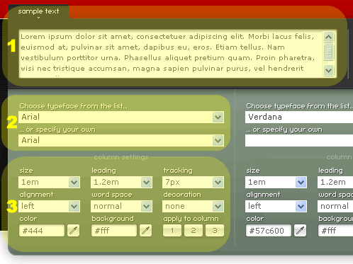 O usuário escolhe valores CSS para uma série de propriedades relacionadas à tipografia, e a interface gráfica da ferramenta retorna um texto padrão (ou um texto digitado pelo usuário) estilizado conforme suas escolhas. E, como bônus a folha de estilos pode também ser visualizada pelo usuário.