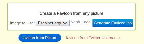 Clique o botão para escolher o arquivo de imagem para o qual você pretende criar o favicon e esta ação fará com se abra uma janela popup com a árvore do seu HD. Vá até o arquivo do ícone que você criou conforme explicado acima, marque-o e clique “Abrir” na janela popup. A janela fecha e o endereço do ícone no seu HD aparece ao lado do botão da escolha. Clique o botão para gerar o favicon e pronto. Está gerado seu favicon que será mostrado em nova tela contendo a visualização do seu favicon e várias outras opções para personalizar (explore a tela á vontade).