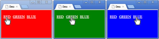Sua missão, caso decida aceitá-la, é fazer com que a cor de fundo da janela de renderização mude quando o respectivo link para a cor é clicado, como mostrado na figura anterior. O não cumprimento de qualquer regra invalida o trabalho. Mas, não se estresse com isso, simplesmente leia as regras e as cumpra.