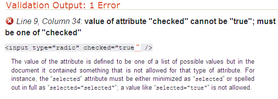 Observe no screenshot a seguir a mensagem que o validador do W3C retornou ao se submeter para validação um documento XHTML 1.0 Transitional contendo o valor “true” para o atributo checked.