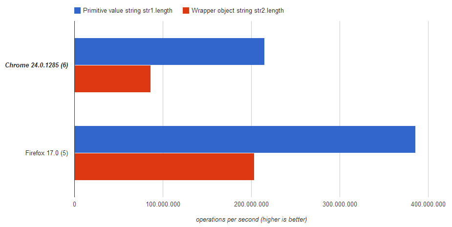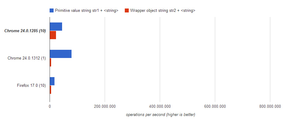 Convém mencionar que o navegador Chrome 22.0.1229 também prefere o objeto String, sendo que para a versão 23.0.1271 foi implementado um novo mecanismo para retornar conteúdos de strings como valor primitivo.