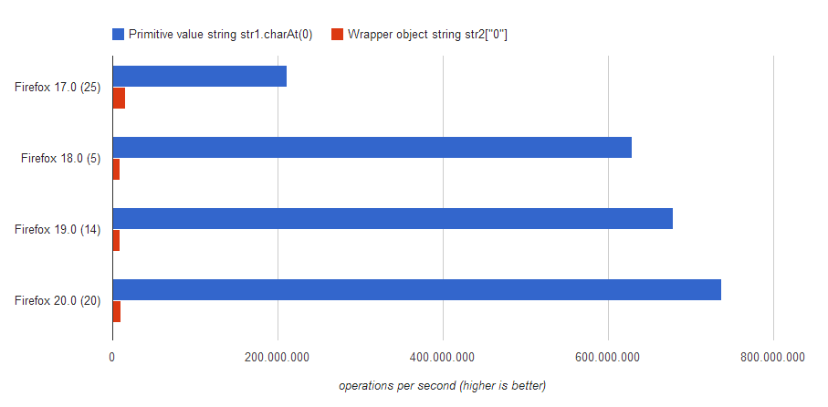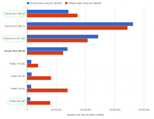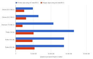 Essa análise de desempenho mostra claramente que inspecionar o valor da primeira string no Firefox 20 é substancialmente mais rápido em stringprimitivo do que em stringobjeto, cerca de 70x de aumento da performance. Para outros navegadores o resultado são semelhante embora com velocidades diferentes. Notar as diferenças entre as versões incrementais do navegador Firefox. Isso é uma indicação de como pequenas variações no código podem afetar a velocidade da execução para determinadas chamadas.
