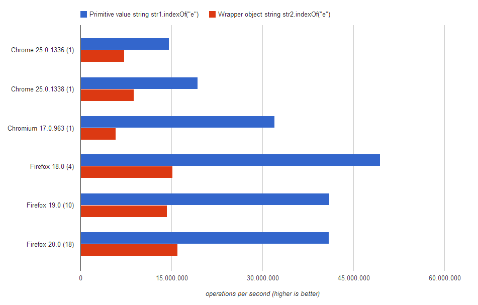 De modo semelhante, para esse caso, podemos notar que o valor da string declarado em stringprimitivo pode ser usado em um número bem maior de operações em relação a stringobjeto. E mais, a engine JS dos navegadores em suas versões incrementais produzem medidas diferentes.