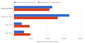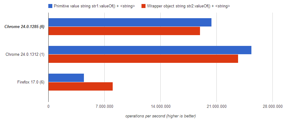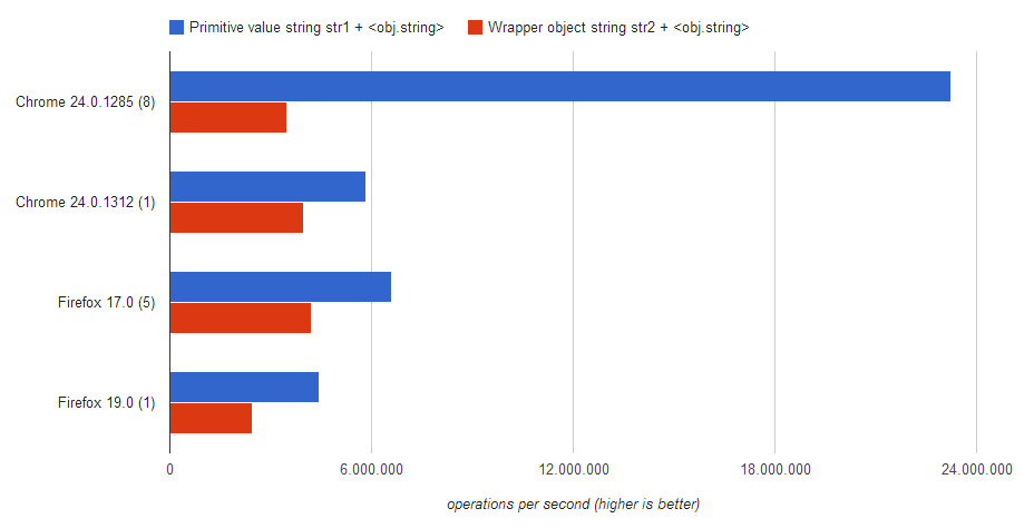 Nos exemplos anteriores vimos que a performance é melhor no navegador Firefox em diferentes versões quando um valor inicial da string é um objeto String, tal como stringobjeto e assim seria normal esperar o mesmo ao adicionar stringobjeto a outro objeto String, o que basicamente é a mesma coisa. Contudo, convém notar que adicionar uma string a um objeto String é mais rápido, no navegador Firefox quando usamos um valor stringprimitivo em lugar de um stringobjeto. Isso prova uma vez mais como pequenas variações no código, tal como caminhos para bugs, conduz a diferentes números em uma análise de performance.