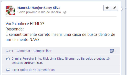 Rapidamente várias opiniões, argumentos e links para matérias contra e a favor foram postadas. Fiquei empolgado com o engajamento do pessoal, e, pelo que pude constatar, realmente a especificação não é clara o suficiente para afirmar que está certo ou errado inserir uma caixa de busca dentro de um elemento nav.
