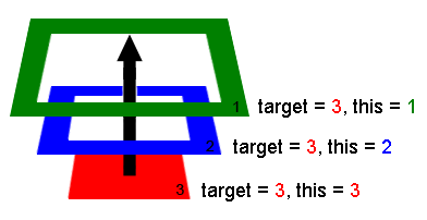 alert("target = "+target.className+", this="+this.className)