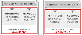 Para fazer as adaptações necessárias devido a esta variação de altura do topo, eu posicionei o elemento de conteúdo (ancestral) (#content). Este elemento aparece na marcação do código imediatamente embaixo do topo e posicionado com position:relative;. Ele se posiciona, no fluxo do documento, sempre abaixo do topo, independentemente da maior ou menor altura assumida pelo topo. Em razão de #content ter sido posicionado, ele cria um novo contexto para seus elementos descendentes. A coluna da direita (#subcol) está contida dentro de #content, desta forma ela permanecerá posicionada no canto superior direito de #content, e não no canto superior direito da página. Isto também faz com que a coluna direita se adapte na posição de acordo com a altura assumida pelo topo, como mostrado no Diagrama 1.