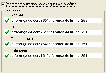Marcando-se o check box 'mostre também os resultados para 'cegueira cromática' será apresentado um sumário dos resultados para 'visão normal' e para 3 tipos de cegueira cromática(Protanopia, Deuteranopia, Tritanopia)