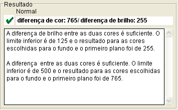 Uma vez selecionada a cor com o ponteiro do mouse (para selecionar dar um clique com o botão esquerdo ou pressionar 'enter' no teclado) o valor hexadecimal da cor irá aparecer em 'hex valor' na caixa de texto e o resultado do teste será atualizado de modo a refletir o valor do brilho e a da diferença de cor para a nova combinação de cores selecionadas.