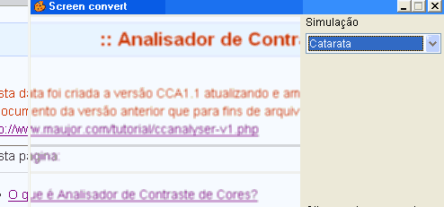 Escolher a opção 'Visor' abrirá uma caixa não dimensionável denominada 'Screen convert'. Clique sobre a barra em cima da caixa e arraste pela tela até a área onde fazer a simulação. Opcionalmente, após abrir o visor ative o modo de movimento teclando M e movimente a caixa com as setas do teclado. Tendo colocado o visor sobre a área a simular, escolha no menu select 'Simulação' o tipo de restrição visual a simular.