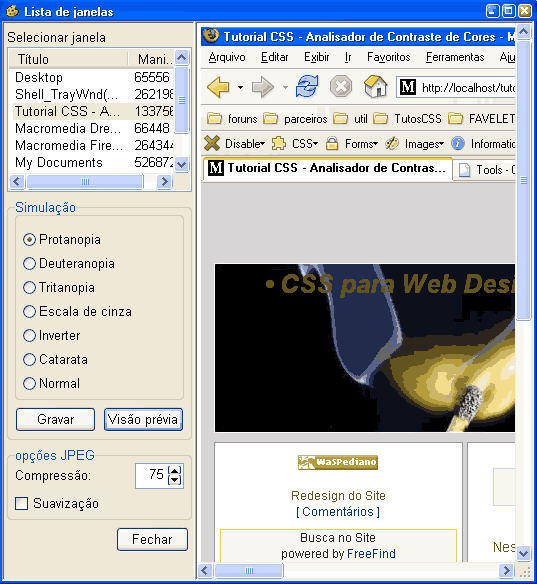 Escolher a opção 'Selecionar janela (Lista)' abrirá uma caixa dimensionável denominada 'Lista de janelas' e será apresentada uma lista das janelas que você tem abertas no seu computador. Escolha uma delas, marque o checkbox da restrição visual a simular e pressione o botão 'Visão prévia'. Em alguns segundos a janela escolhida será apresentada à direita simulando a restrição escolhida. Marque outro checkbox, pressione 'Visão prévia' e o processo se repetirá.