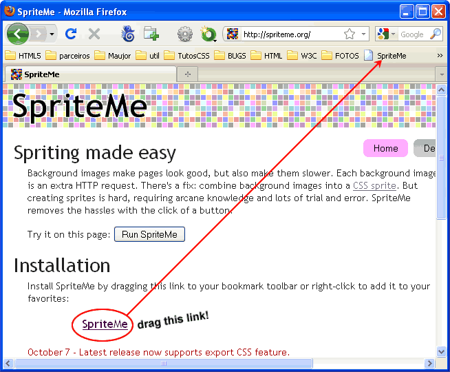 A ferramenta SpriteMe é um bookmarklet (ver definição na Wikipedia), para instalar abra o site da ferramenta clique e arraste o link SpriteMe para a barra de favoritos do seu navegador ou clique com o botão direito do mouse no link e adicione o URL do link nos Favoritos.