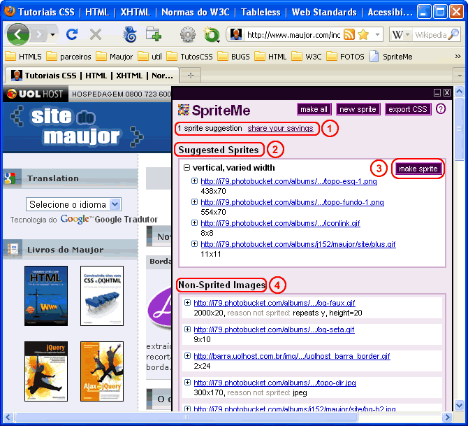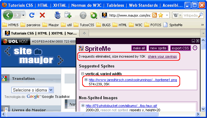 - A ferramenta informa quantos conjuntos de imagens ela sugere para Sprite na página. Clicar o link "share your savings" autoriza a ferramenta a ferramenta a colocar para visualização pública o resultado da sua utilização em um log que pode ser visualizado no link "Savings" do menu principal da ferramenta (não mostrado nas figuras). Ver o link Savings da ferramenta.
