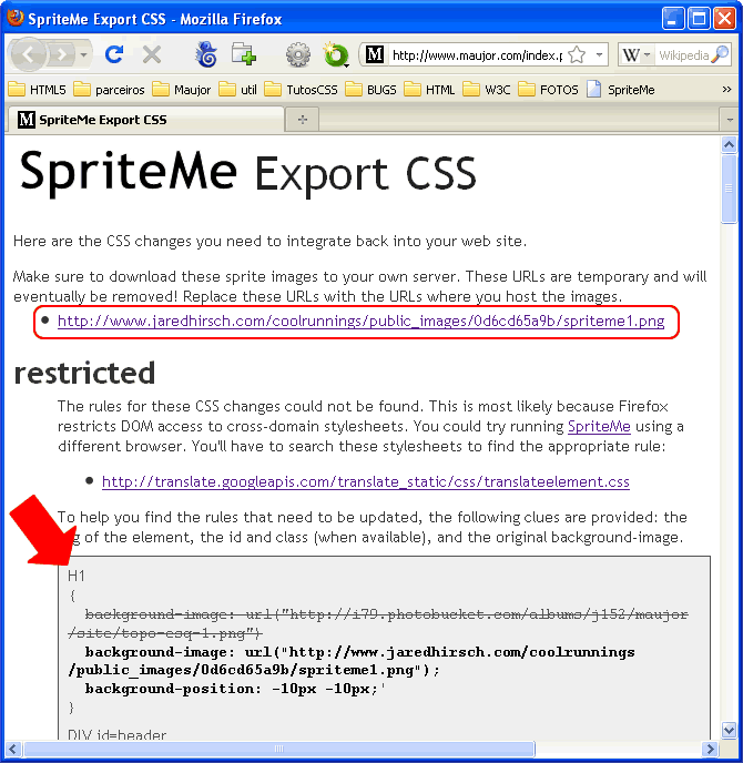 Além disso você pode arrastar e soltar imagens entre os boxes iniciais sugeridos pela ferramenta, sem necessidade de abrir novo box vazio. - Clicar o botão "export CSS" abre uma página contendo o endereço da imagem única e as novas regras CSS conforme mostrado na segunda figura a seguir.