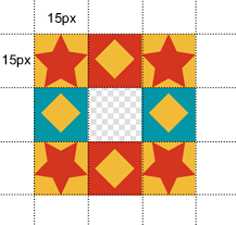 Trata-se de uma imagem construída com nove módulos de 15x15px. Para facilitar o entendimento da maneira como o mecanismo das CSS funcionam ao manipular uma imagem destinada a personalizar bordas vamos identificar os diferentes mólulos da imagem mostrada conforme descrito a seguir: