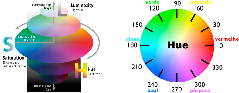 Hue = tom, Saturation = saturação e Lightness = luminosidade.