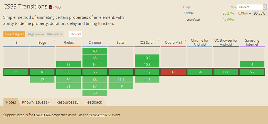 O Módulo CSS Transitions Module Level 3 (link abre em nova janela) encontra-se na fase de Rascunho de Trabalho do W3C, contudo já foi implementado pelos navegadores modernos, e para alguns navegadores antigos com uso de prefixos proprietários (-moz-, -webkit-, -o-).