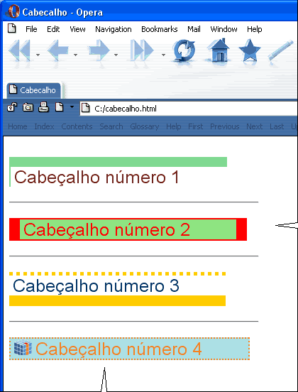 Na figura abaixo você tem uma imagem de como um browser renderizou 04 (quatro) cabeçalhos que servirão de base para o desenvolvimento das técnicas explicadas neste tutorial.