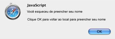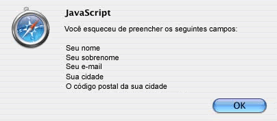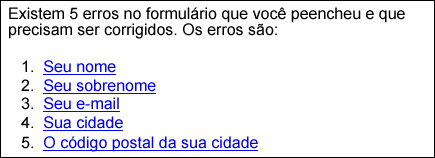 Frequentemente usa-se JavaScript para validar formulários de modo a que todos os erros cometidos sejam coletados e apresentados ao usuário em um grande alerta único, como mostrado abaixo: