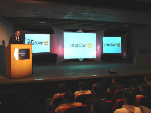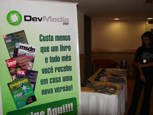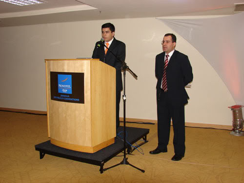 Tiago Baeta, do iMasters, faz a abertura do evento no Auditório "Programação e Tecnologia", sendo observado por Alex Falcão, apresentador deste auditório.