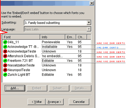 Observe que somente as fontes com comentário "Installable" ao lado terão bom resultado. Todas as outras vão dar erro.