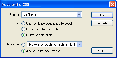 Na caixa Novo estilo CSS, marque Tipo: Utilizar o seletor CSS - Definir em: Apenas este documento - Seletor: Digite .barNav a Clique