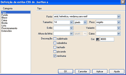 Na caixa Definição de estilos CSS de .barNav a, na Categoria Tipo marque, Fonte:Arial, Helvetica, Verdana, sans-serif - Tamanho: 14 - Peso: negrito - Cor: #000000 - Decoração: Nenhuma.