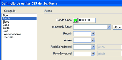 Na caixa Definição de estilos CSS de .barNav a, na Categoria Fundo marque, Cor do fundo:#00FF00.