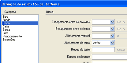 Na caixa Definição de estilos CSS de .barNav a, na Categoria Bloco marque, Alinhamento do texo:centro.