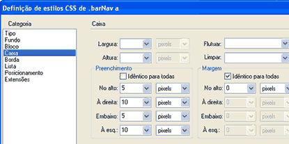 Passe para a Categoria Caixa e marque Largura, Preenchimento e Margem, conforme mostrado na figura abaixo. ATENÇÂO: No Preenchimento, desmarque "Idêntico para todas" e na Margem deixe marcada "Idêntico para todas", pois estamos definindo preenchimentos deferentes nos lados da caixa e borda de zero pixel, nos quatro lados da caixa.