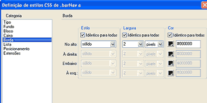 Passe para a Categoria Borda e defina Estilo, Largura e Cor, conforme mostrado na figura abaixo. ATENÇÂO: Deixe marcada as caixas "Idêntico para todas", pois estamos definindo bordas iguais, nos quatro lados da caixa.