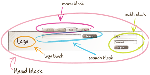 Bloco (block) é uma entidade independente da aplicação/website. Um bloco pode ser simples ou composto (conter outros blocos). Basicamente um bloco é um container cujos conteúdos são elementos da marcação HTML, ou ainda, outros blocos. No processo de desenvolvimento é interessante e útil criarmos marcação HTML específica para os blocos que compões a aplicação/website.