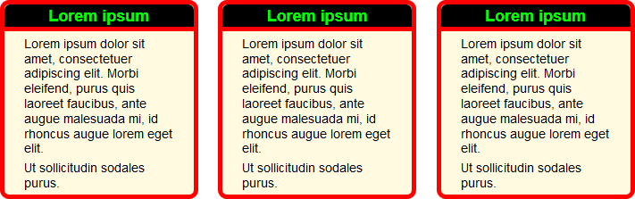 Desafio: Na interface do JSFiddle alterando somente regras CSS, obtenha o visual mostrado na figura a seguir para os três boxes. Não altere a marcação HTML, apenas acrescente novas regras CSS, pois é exatamente assim que funciona a modularização CSS.
