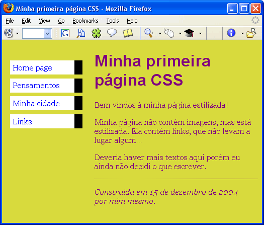 <!DOCTYPE html PUBLIC "-//W3C//DTD HTML 4.01//EN"> <html> <head> <title>Minha primeira página CSS</title> </head> <body> <!-- Menu de navegacao do site --> <ul class="navbar"> <li><a href="index.html">Home page</a> <li><a href="pensamentos.html">Pensamentos</a> <li><a href="cidade.html">Minha cidade</a> <li><a href="links.html">Links</a> </ul> <!-- Conteudo --> <h1>Minha primeira página CSS</h1> <p>Bem vindos à minha página estilizada! <p>Minha página não contém imagens, mas pelo menos está estilizada. Ela contém links, ainda que eles não levem a lugar algum… <p>Deveria haver mais textos aqui porém eu ainda não decidi o que escrever. <!-- Date e assine sua página, isto é educado! --> <address>Construida em 15 de dezembro de 2004<br> por mim mesmo.</address> </body> </html>